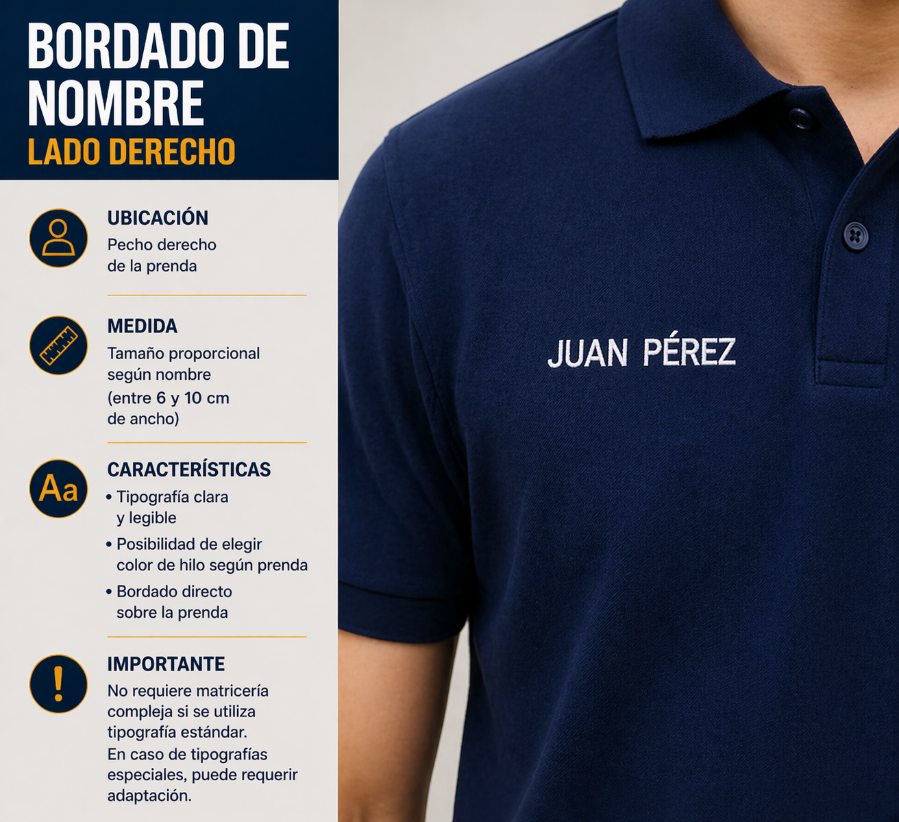 Aplicación de nombre individual mediante bordado, ubicado en el lado derecho del pecho.