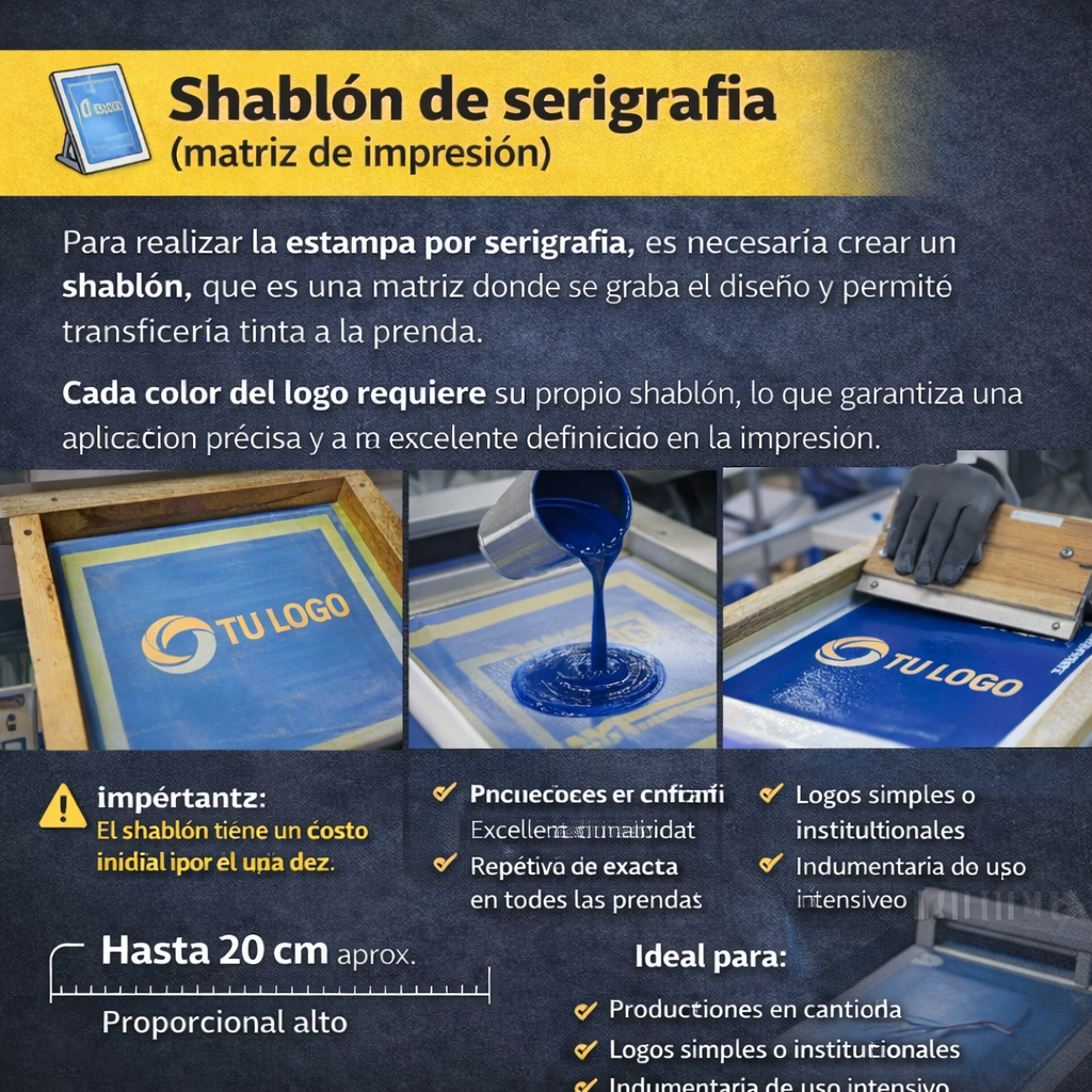 Cada color del logo requiere su propio shablón, lo que garantiza una aplicación precisa y una excelente definición en la impresión.